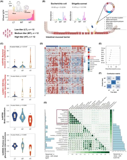 图1自闭症谱系障碍(ASD)中小麦IgG4抗体升高和相关病原体易感性。(A)根据小麦IgG4滴度,参与者分为LT(14.05 [11.60,19.13] U/L)、MT(40.60 [30.78,48.28] U/L)和HT(172.85 [136.48,547.20] U/L)组。(B)柱状图显示,HT组对志贺氏菌和大肠杆菌DSM 30083的易感性增加,表明肠道屏障受到破坏(详见图S3B、表S3)。(C)方框图描绘了各组中四种KEGG通路丰度的变化,HT组中感染相关通路上调,碳水化合物代谢通路下调,表明免疫状态会影响微生物通路的活性。(D)热图描绘了153种病原体或机会性病原体的相对丰度,揭示了不同滴度组(门到属)的不同特征。颜色强度反映了行归一化后的z分数,说明了微生物组成的变化。(E)散点图展示了随机森林中的七个顶级微生物特征(按平均减少准确度排名),这些特征被选为IgG4滴度分类的预测因子。(F)混淆矩阵显示了随机森林模型在与七个特征进行十倍交叉验证后的0.8333测试准确性,证明了微生物丰度对IgG4分类的判别能力。图S2A显示了详细的微生物组丰度变化。(G)从图1D中可以看出,相关热图显示ko05100途径(细菌入侵)与微生物之间存在显著的斯皮尔曼相关性(p<0.05)。左侧柱状图强调了这些微生物与小麦IgG4之间的直接联系,强调了微生物丰度、小麦IgG4滴度和致病机制之间的关系。LT,低滴度。MT,中等滴度。HT,高滴度。Bonferroni在Kruskal-Wallis检验后调整了p值,*p值<0.05。
