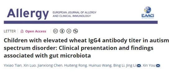 参考文献:Tian Y, Luo X, Chen J, Rong H, Wang H, Li B, Li J, You X. Children with elevated wheat IgG4 antibody titer in autism spectrum disorder: Clinical presentation and findings associated with gut microbiota. Allergy. 2024 Aug 2. doi: 10.1111/all.16244. Epub ahead of print. PMID: 39092541.