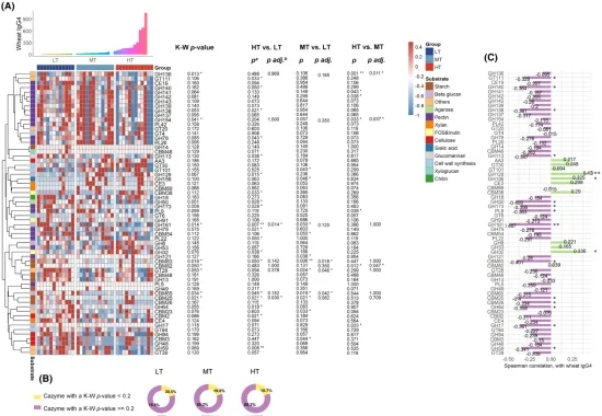 此外,我们的分析表明,高小麦IgG4滴度对应于肠道微生物碳水化合物激活酶(CAZymes)谱的改变,特别是影响膳食纤维代谢。具体而言,果胶、β-葡聚糖和纤维素的降解减少,但果聚糖和菊粉的水解增加(附录S3,图2A)。值得注意的是,Kruskal-Wallis p值<0.2的CAZymes在LT、MT和HT组的总CAZymes基因中始终占很大比例(19.7%-20.5%),这意味着在肠道碳水化合物代谢中起着关键作用(图2B)。Spearman相关分析表明,62个CAZymes中有14个与小麦IgG4呈负相关(p<0.05),而3个呈正相关(图2C)。RF模型有效地区分了三个样本组,加强了观察到的区别(图S4A-D)。