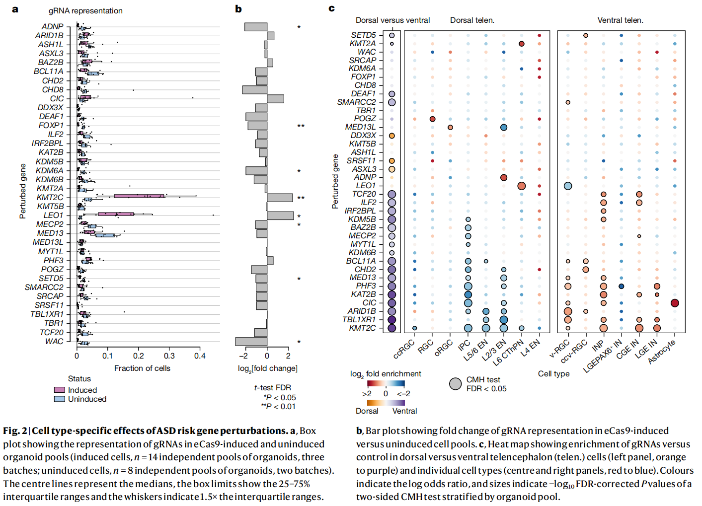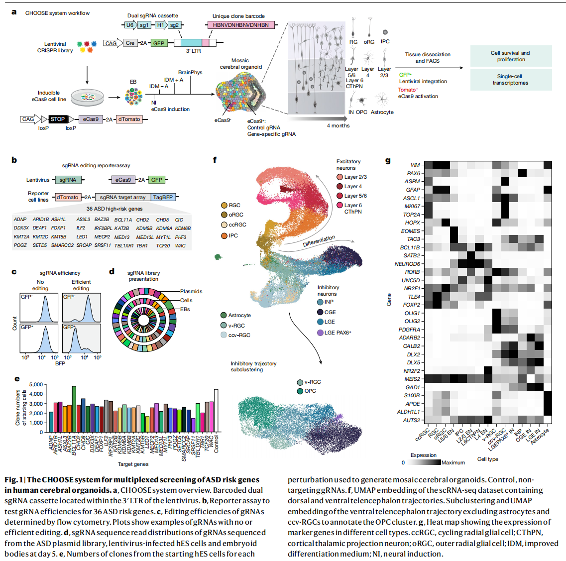 人类大脑的发育涉及独特的过程(在许多其他物种中没有观察到),这可能导致神经发育障碍。脑类器官使得在人类背景下研究神经发育障碍成为可能。我们已经开发了crispr -人类类器官-单细胞RNA测序(CHOOSE)系统,该系统使用经过验证的诱导RNA对基于crispr - cas9的遗传破坏和单细胞转录组学在花叶类器官中筛选功能丧失。这里我们展示的是36个与转录调控相关的高危自闭症谱系障碍基因揭示了它们对细胞命运决定的影响。我们发现背侧中间祖细胞、腹侧祖细胞和上层兴奋性神经元是最脆弱的细胞类型。